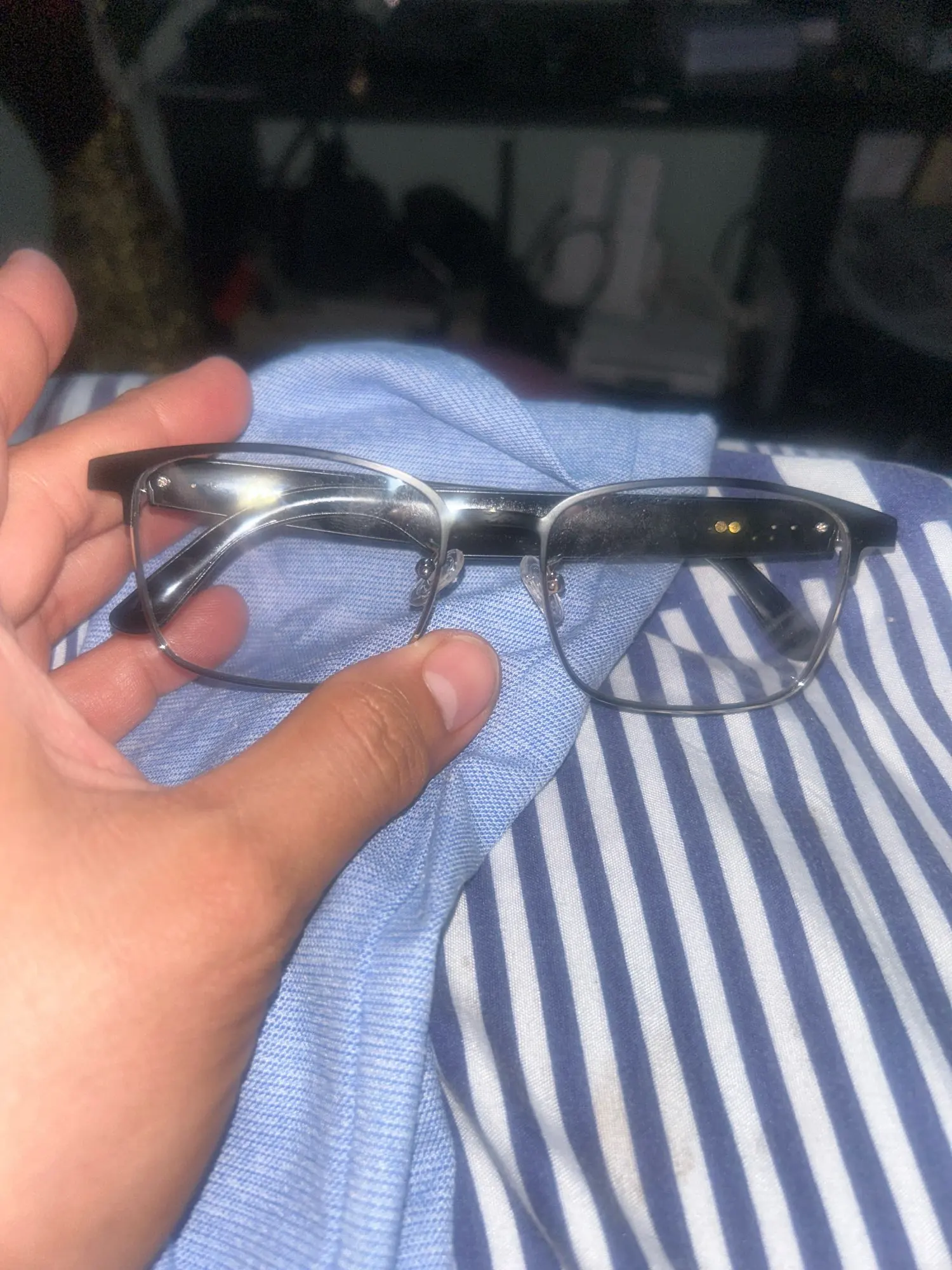 막귀인데 소리가 장난감같아서 안좋아요.. 그냥저냥 써볼라했는데 코받침 조절하다가 뿌러지네요 내구성 최악입니다. 기존에 안경 착용하고있어요.. 구조가 안경테만 빼면 안경에 이식가능할거같아서 빼는데 중국나사입니다.... 두번돌리니 야마납니다 ㅋㅋ 어찌어찌 벌리고 접고하서 뺄려는데 안경테 나사체결부위 뿌러집니다;; 30분만지고 쓰레기통 직행했습니다ㅎㅎ 아랫쪽 은색부위 싸구려 장난감 가짜 도금 철느낌이네요 살짝힘주면 툭 부러져요 체결부위도 같아요 빨리부셔진게 다행이네요 이거쓰고 다니다 살짝부딛혀서 체결부위 바로 아작날거 생각하니 다행이네요